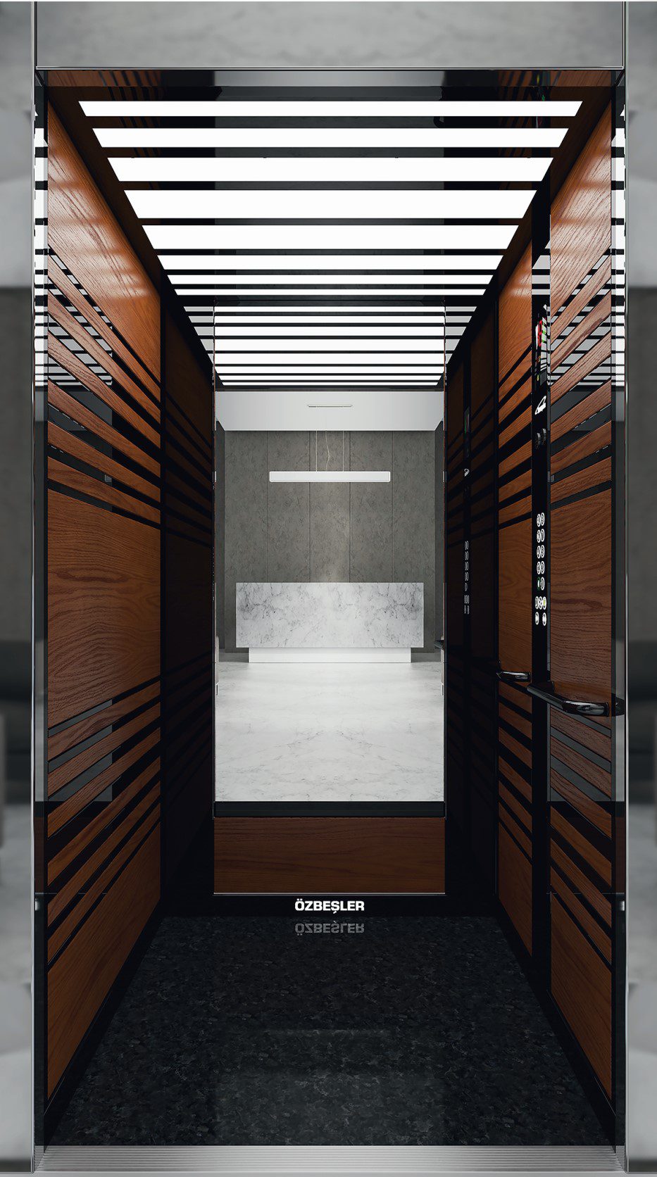 Кабіна FLUENT 50 від Ozbesler Elevator поєднує чіткість горизонтальних ліній із натуральною естетикою дерева. Ламіновані панелі з текстурою натурального дерева створюють теплий, затишний інтер’єр, який гармонійно вписується як у житлові комплекси, так і в ділові об’єкти.