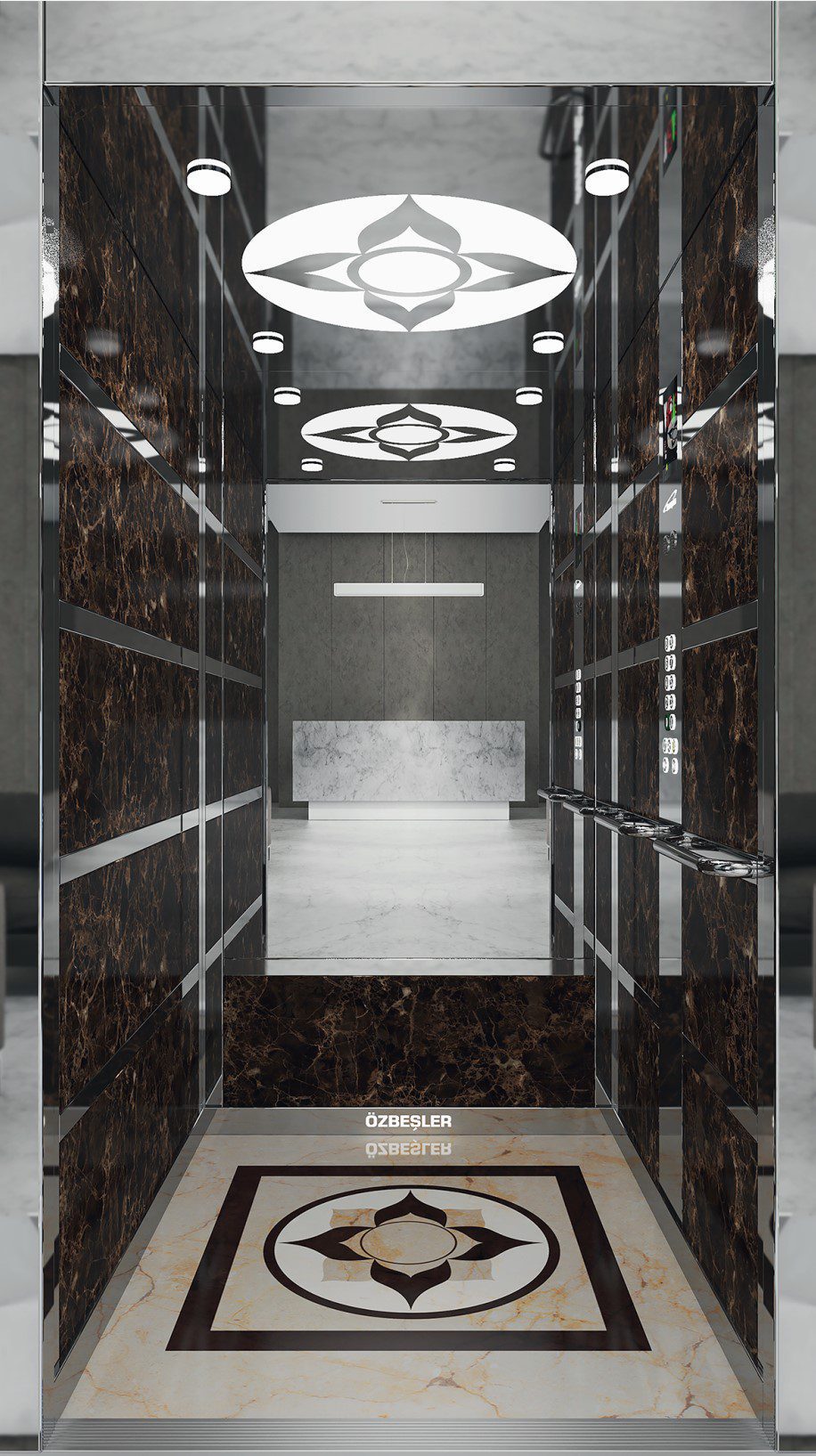 Кабіна FLUENT 80 від Ozbesler Elevator — це стильне рішення для тих, хто прагне надати простору розкішного вигляду без надмірної вартості. Її оформлення базується на горизонтальних ламінованих панелях під мармур, які точно імітують текстуру натурального каменю та додають інтер’єру глибини та візуальної цінності.
